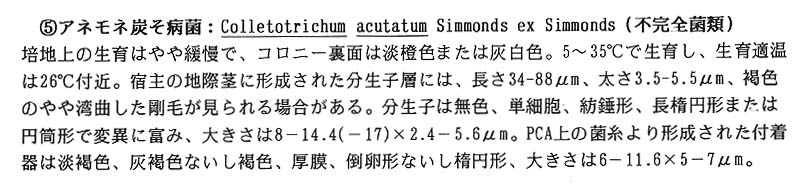 再同定病害:⑤アネモネ炭そ病は愛媛県重信町および松山市の施設で発生し、苗腐敗、生育不良、葉のカール、花柄の捻れ等が起き、腐敗苗や地際部に橙褐色の分生子塊が形成されるのが特徴。定植直後と着花期に多発する。病原菌Colletotrichum