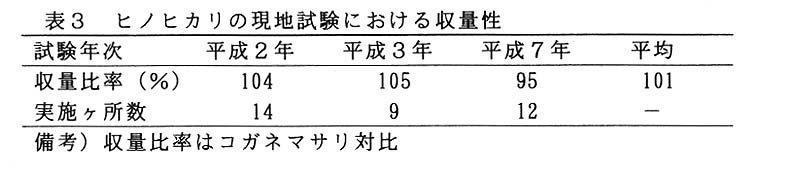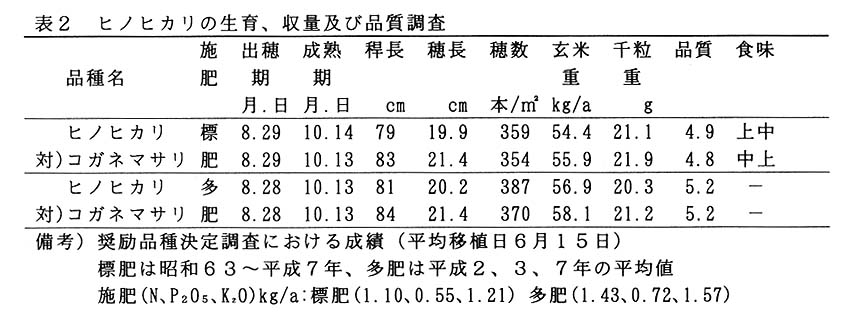 このため、普通期栽培で食味・収量の安定した中生品種の導入が要望されており、宮崎県総合農業試験場で育成されたヒノヒカリの特性と適応性について検討した。