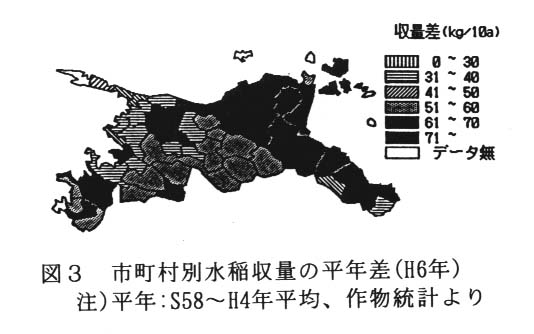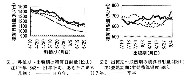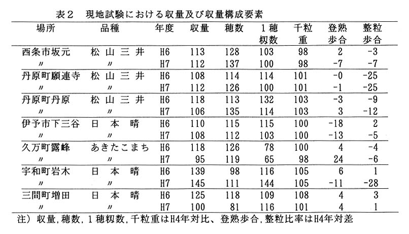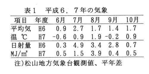 愛媛県の平均収量と作況指数は、平成6年度が531㎏/10aと113、平成7年度が512㎏/10aと109であり、本県の平均収量が初めて500㎏台の2年連続の豊作となった。この豊作に関連する要因を明らかにする。