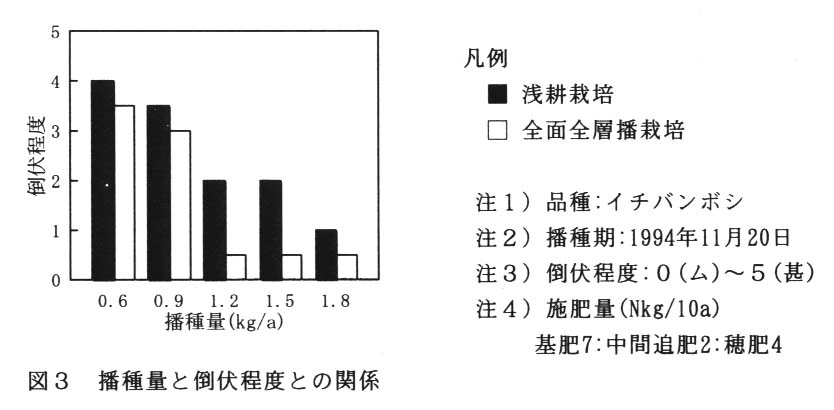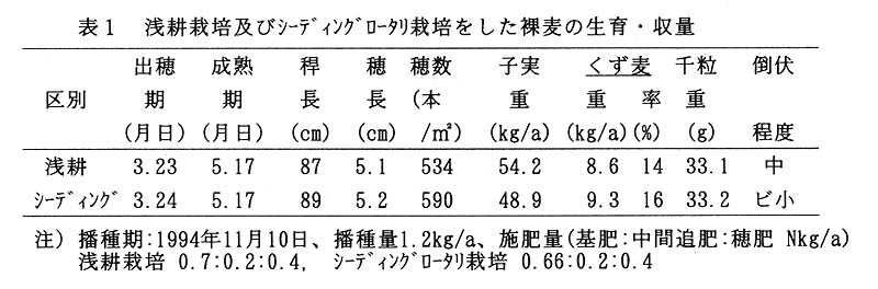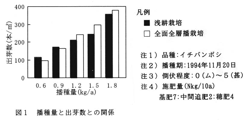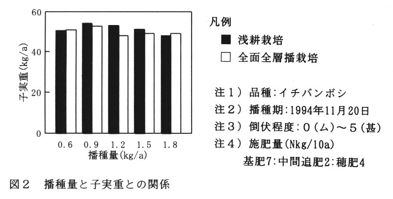 本県の裸麦栽培は全面全層播で広く行われているが、さらに省力的な栽培技術が望まれている。低コストの点で不耕起栽培が注目されるが、出芽が不安定であるため、水稲跡水田で基肥と種子を全面に散布後、ロータリで浅く(深さ約2㎝)耕起して播種作業を行う浅耕栽培技術の開発を行っている。ここでは、全面全層播栽培及びシーディングロータリ栽培と対比させて浅耕栽培の播種量について検討する。