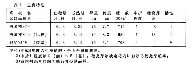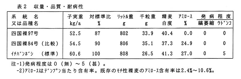 裸麦は近年の急激な作付け面積の減少によって生産量が激減し、水田裏作麦を中心とする裸麦には増産による安定供給が強く求められている。その中で、モチ性大麦の利用は現在では麺類、和菓子等に限られているが、ウルチ性品種と同様に味噌用や主食用への用途拡大も検討されており、在来品種等に代わる優良品種の育成とともに、新しい用途開拓のためにも画期的な新品種の開発を急ぐ必要がある。人為突然変異系統の四国裸97号はアミロースを全く含まないモチ性裸麦であり、新用途の開発が期待される。