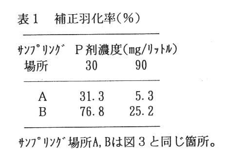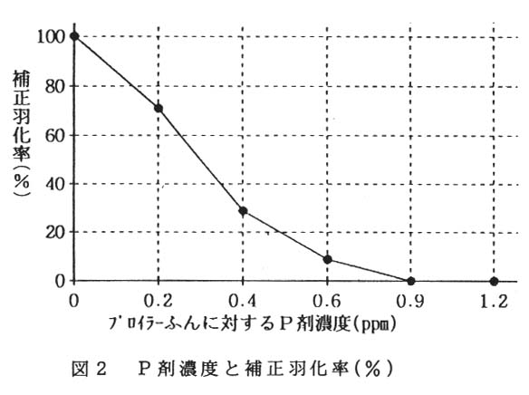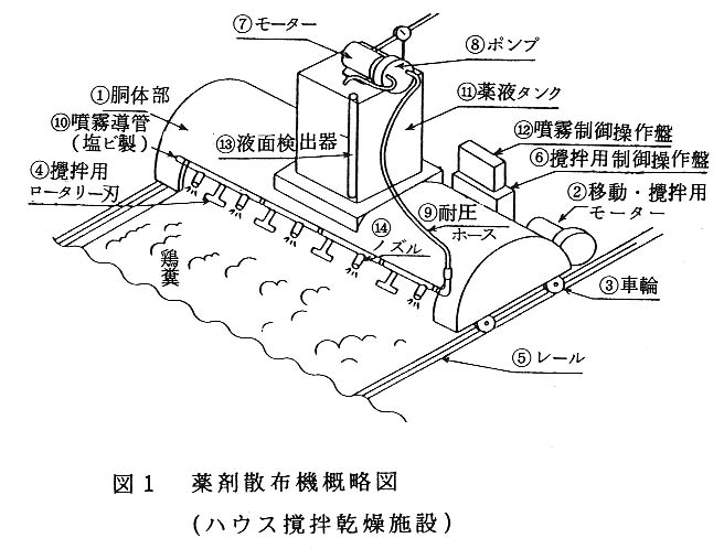 薬剤の効果判定は、薬剤散布後に4日齢のイエバエの幼虫をふんに接種し、回収した蛹の羽化率を調査した。また、水分含量の多い採卵鶏ふん・牛ふんへの水分量の上昇を最小限に押さえるため、薬剤散布は霧状の噴霧ノズルを使用した。