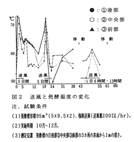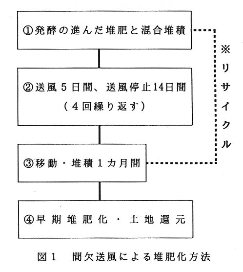 腐熟度の高い良質な堆肥を生産するためには、長期間の堆積が必要であるが、特に敷料として多く利用されているオガクズには多量のリグニンが含まれており、早期堆肥化を妨げる原因となっている。一方、床面からの強制送風方式を取り入れた堆肥舎が普及しつつあるが、間欠送風の効果的な実施方法は確立されていない。