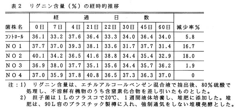 オガクズは、吸水、吸臭効果が高いため畜舎の敷き料として広く利用されている。しかし、オガクズ中にはリグニンが約30%含まれていて、その分解は大変遅く、完熟しない堆肥を作物に施用した際の生育障害が指摘され、問題となっている。そこで、リグニン分解能の高い担子菌を利用してオガクズ混入堆肥の早期完熟化の方法を検討する。