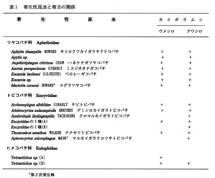 寄生性天敵昆虫として、ウメシロカイガラムシに対して13種、クワシロカイガラムシに対して14種の奇生峰が確認され12種が共通していた。それらのうち、