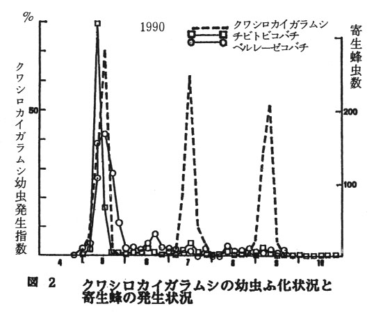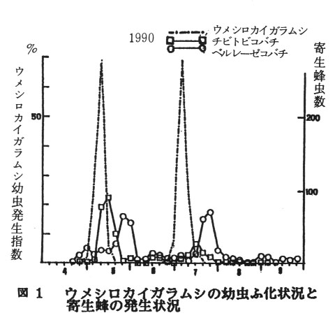 発表論文等:ウメシロカイガラムシとクワシロカイガラムシの幼虫ふ化消長と寄生性天敵昆虫、徳島県果試研報、7号、1989
