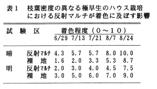 枝葉密度が高くて光環境が不良な暗区は、枝葉密度が低くて明るい明区に比べて樹冠内の照度は1/4以下に低下し、暗区は明区に比べて夏期の着色が遅かったが、着色開始期の5月下旬に反射フィルムを樹冠下マルチすると、暗区では着色が裸地区よりも20日程度促進された。しかし明区の反射マルチ区では逆に着色が遅延した(