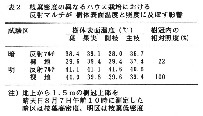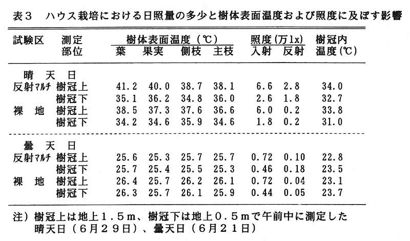 反射フィルムは晴天日の明区では、60%近く反射し樹冠下の照度を高め、同時に樹冠内の温度を高めた。梅雨の曇天日では反射マルチの効果は晴天日に比べて小さかったが、樹冠内の温度は裸地区に比べてむしろ低下した(