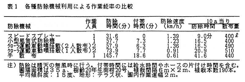 機械利用による10a当たりの防除時間を手散布と比べると、スピードスプレヤーで5倍、小型風筒式防除機及びクローラ式運搬車に動噴とタンクを搭載し2人が散布した区で約2.5倍、クローラ式運搬車に動墳とタンクを搭載し、1人が運転1人が散布した区で約2倍作業能率が優れる。薬剤散布は、手散布に比べクローラ式運搬車に動墳とタンクを搭載し、畦畔ノズルを使用した区で約14%多く必要である(