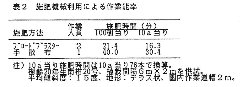 クローラ式運搬車に肥料散布機(M社製、ブロードブラスター)を搭載し、クロラー式運搬車の運転者ともう1人が荷台に乗り、肥料散布機を操作し、施肥を行った区と手散布施肥(1人)と作業時間を比較した。作業能率は手散布に比べ機械利用により約2倍優れる(