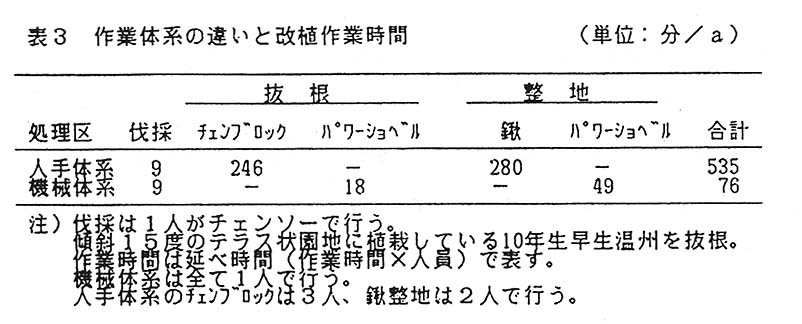 改植に必要な作業をパワーショベル(1.5トン)を用い、人手作業と比較すると、抜根は人手に比べ約14倍、整地は約5倍作業性が優れる(
