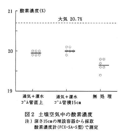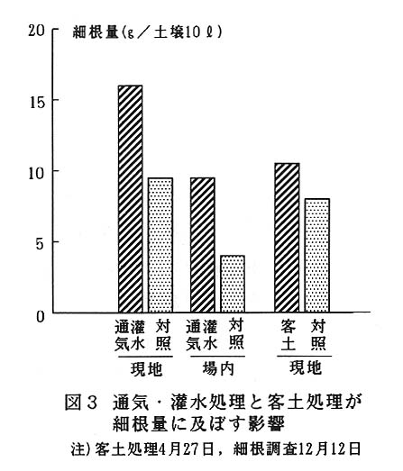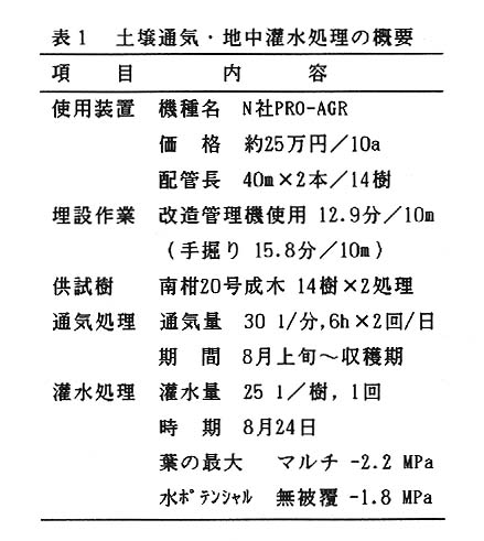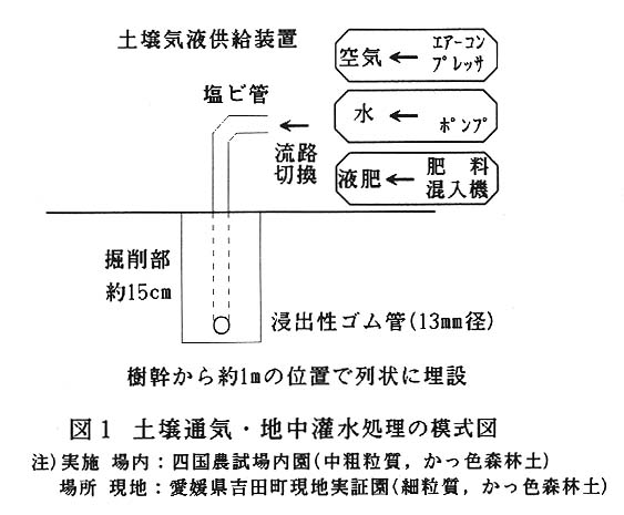 細根発生の主要な制限要因である土壌空気及び水分条件を改善するため、樹冠外周のやや内側に微細孔隙を有する浸出性ゴム管を深さ15~20㎝の位置に列状に埋設して、これに連結した空気圧縮機によって通気処理を行うとともに、干ばつ時には流路を切り換えてポンプによる地中灌水を行う(