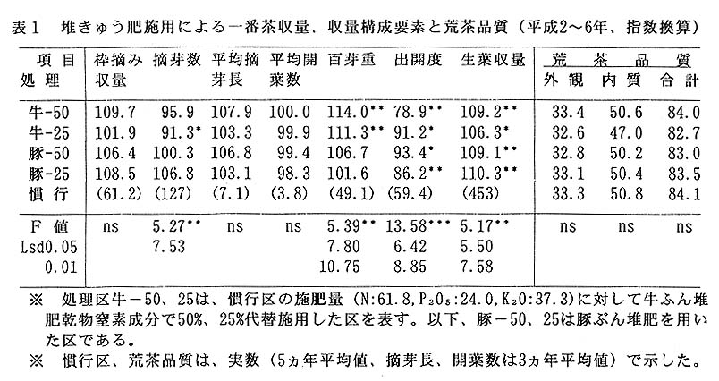 茶栽培においては、収量増大と品質向上を目的として一般に多肥栽培されている。化学肥料の使用が多く、肥料費は生産費の3割以上を占めている。多肥栽培は環境への負荷を大きくするが、生産性の向上には必ずしも結びついていない。そこで、環境にやさしく良質で廉価な茶生産を目的として、畜産副産物である堆きゆう肥(牛、豚)の肥料としての代替効果並びに土壌改善効果について検討した。