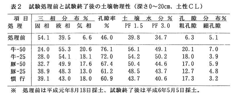 土壌物理性については、牛ふん堆肥施用区の固相率が低く、液相率が高く処理前及び慣行施肥区から比較して大幅な改善が図られる。孔隙率は、牛ふん堆肥区と豚ぷん堆肥50%代替施用区で改善効果は高い。一方、土壌水分率は、処理前土壌及び慣行施肥区に比較し、堆きゆう肥施用区で高く改善される。これらのことから、堆きゅう肥を連年施用することにより土壌物理性及び保水性、排水性の改善効果が見られる。(