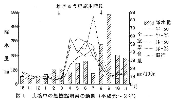 土壌中の無機態窒素の動態は、堆きゆう肥施用区と慣行施肥区はほぼ同じ変動傾向を示した。(