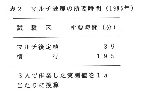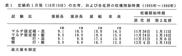被覆作業の軽減化を図ることが可能である。マルチ後定植を行うと、初期生育が旺盛となり、頂花房の収穫開始時期がやや早まるが、第2花房の収穫時期はやや遅れる。