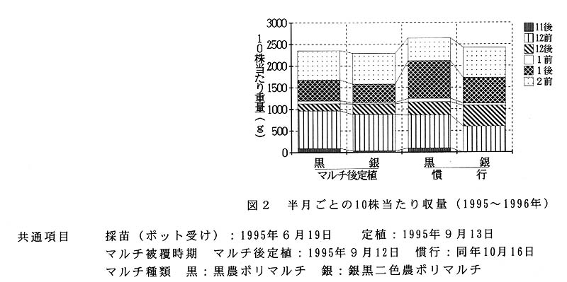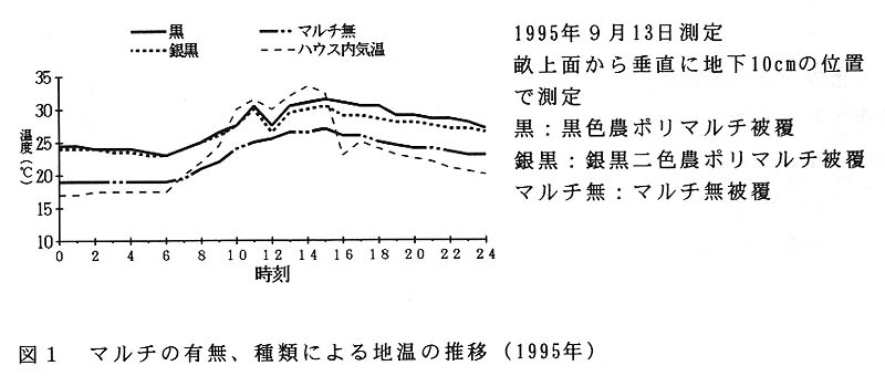 マルチの種類による差については、銀黒二色農ポリマルチの方が黒農ポリマルチより定植直後の地温がやや低いが、収穫開始時期、収量ともやや劣る(