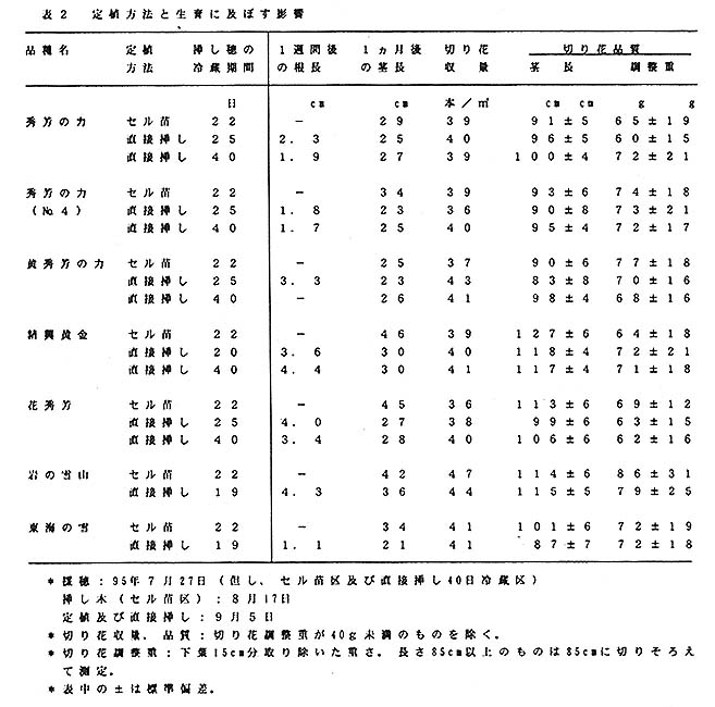 適応性について調査した。「精興黄金」、「花秀芳」、「岩の雪山」では発根が著しく早く、直接挿し栽培に適する。挿し穂の冷蔵処理は生育促進効果があり、品質も良好となる。