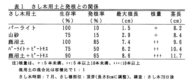 さし木用土は、鹿沼土単用での発根率が高くなったが、これにピートモス(酸度未調整)を混合することで根量や根の伸長が良好となる(