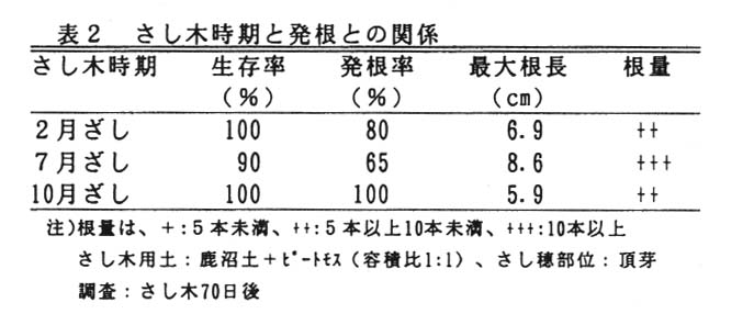 さし木時期は10月ざしで最も発根率が高くなったが、基本的にはどの時期でもさし木は可能である(