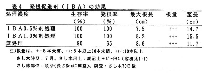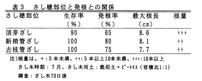 さし穂部位は、頂芽だけでなく管ざしも可能で、根量は頂芽よりも少なくなるが発根率は高い。また管ざしでは、基部の古い枝でも十分な発根個体が得られる。(