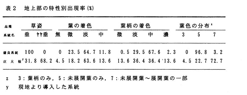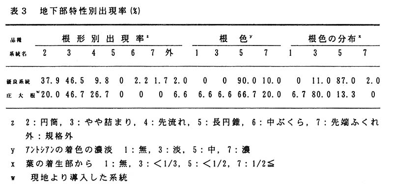 そこで根形が円筒形の尻詰まりで肉質が良く、晩抽性の利用価値の高い優良系統の選抜を行った。