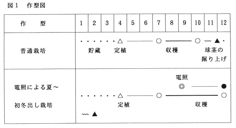 4月中旬に貯蔵根が2個以上ついた球茎ハウス内に定植すると、自然日長では7~10月まで採花できる(