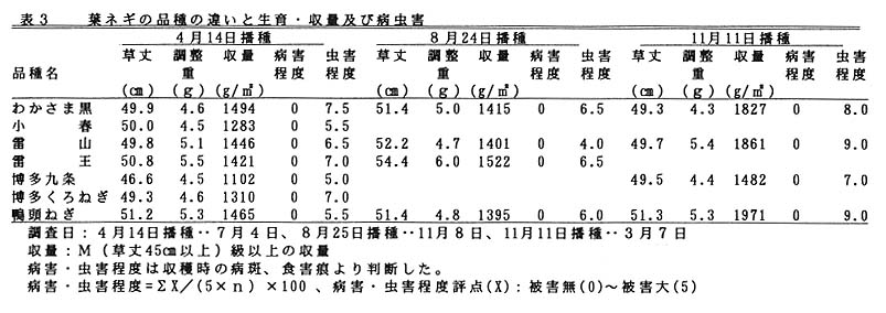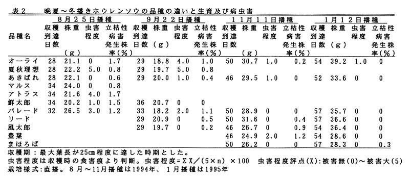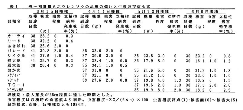 1の条件下で、ホウレンソウの立枯れ性病害は6月播種および8~9月播種で、虫害は5月播種及び8~9月播種でやや多くなる。葉ネギでは病害は周年見られず、虫害はどの播種期においても同程度の被害である。しかし、いずれについても被害程度は低く、商品性を損なうほどではない。また病虫害に明瞭な品種間差は認められない(