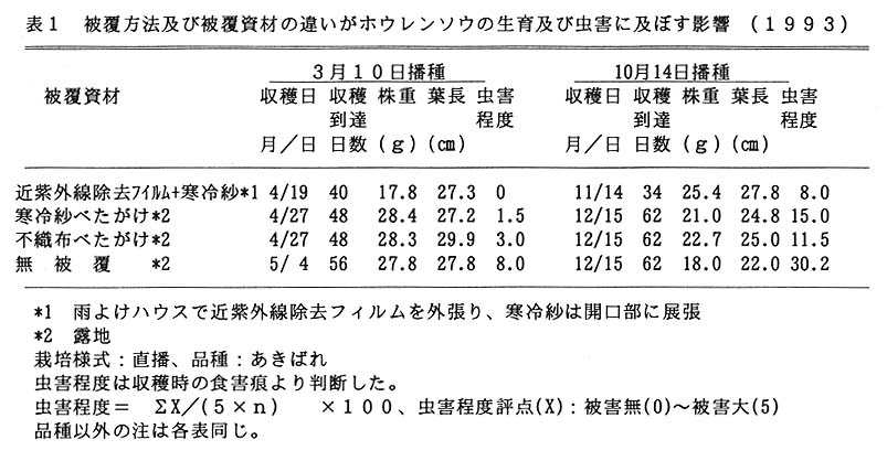 茎葉を収穫の対象とするホウレンソウ、葉ネギは食葉性害虫による被害が発生すると商品性が失われる。そこで省農薬栽培のための被覆資材を利用した物理的方法による虫害の回避技術について検討した。