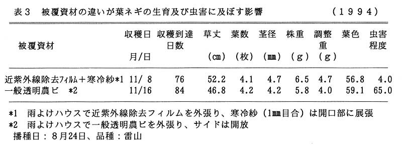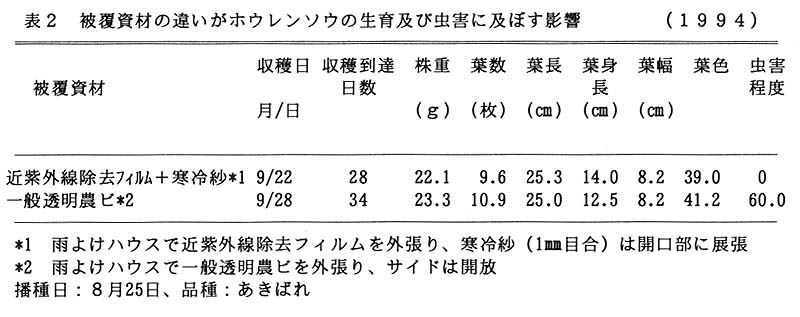 が可能となる。また近紫外線除去フィルム被覆下では生育が促進され在圃期間が短縮される。
