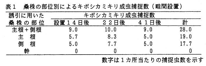 そこで、これをキボシカミキリ用に改良し、誘引源に抜根桑株を用いたネットトラップによるキボシカミキリ成虫の誘引捕捉法について検討した。