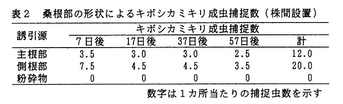 抜根桑根部の粉砕物は、室内試験では強い誘引性か認められるが、圃場での誘引源としては活性か劣る(