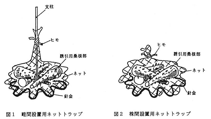 ネットは、ナイロン双撚糸製、糸の太さ0.1㎜、網目一辺6.7㎜、大きさ80×150㎝(収縮時)の長辺側一方に200㎝の針金、他方にヒモを通したものを用いる。ネットトラップ作製は、畦間設置する場合、支柱を立てその根元に適当な大きさに切断した桑根部を置き、ネットの針金側を下にして桑根部を囲み、ヒモを桑根部の直上で支柱に縛る。