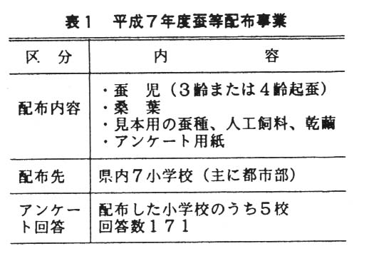 最近の教育現場では、理科離れ等の問題に関心が高く、子供たちの身近な観察によって興味・関心を深め、探求心を伸ばすことのできる環境整備が重視されつつある。とくに生物教育のあり方を反省する機運は高い。このような中で、教材としての蚕利用に注目される背景が生まれた。しかし、蚕が教材として利用される場合にいくつかの問題や課題等が想定されるにも関わらず、供給する側にこれまでの経験や知識に乏しい状況があった。このため、教材として利用される上での課題等を探求する目的で、主に子供たちを対象とした意識調査を実施した。