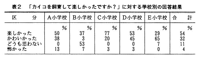 全体に対する好意的回答の占める割合を学校別で見ると、40%から98%の幅で差があったことは、授業内での取り組み方法が微妙に影響したものと考えられる(