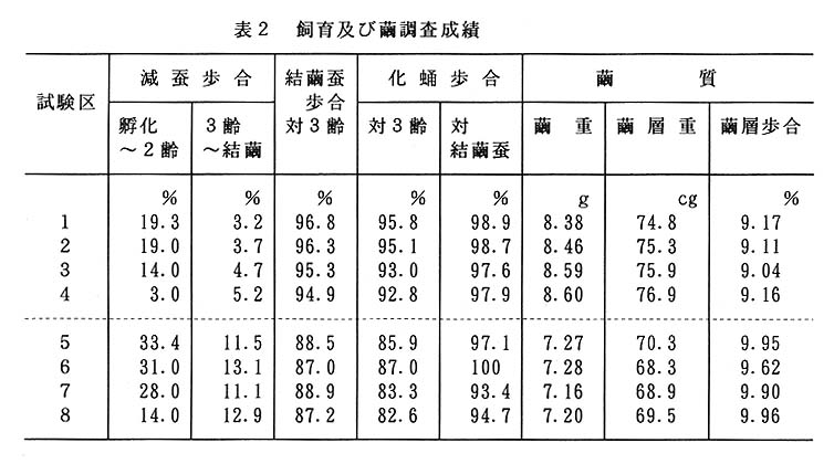 1~2齢期の滅蚕歩合は人工飼料育に比べやや高いが、これは孵化直後から2齢前半期にかけてのクモ類の捕食による。3齢期以後の減蚕歩合、繭質等にほとんど差はみられない(