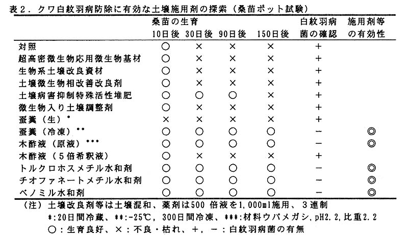 )、冷凍蚕糞および木酢液は、白紋羽病初期発生における有機無農薬防除剤としてスポット施用の可能性がある。
