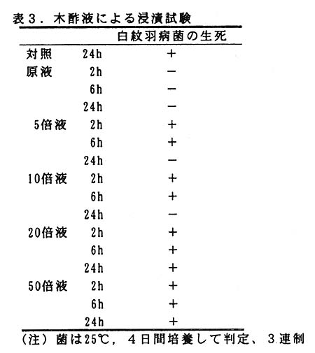 クワ白紋羽病菌培養桑技切片を木酢液原液、5倍希釈、10倍希釈液に浸漬した結果、実験的に殺菌効果が認められ(