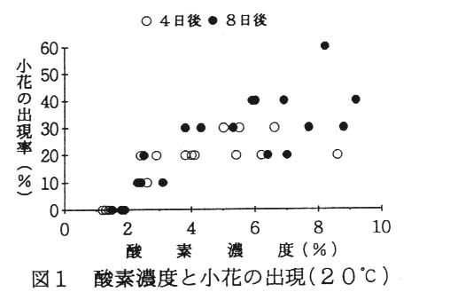ミョウガ花蕾中の小花の伸長は、酸素濃度の影響を強く受け、低酸素ほど抑えられる頃向を示し、酸素濃度が1~2%で完全に抑制される(