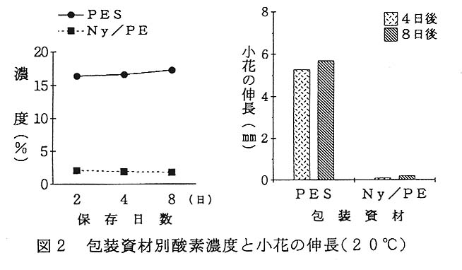 ナイロン/ポリエチレン(Ny/PE)包装では、フィルムのガス透過量か少なくて包装内の酸素が呼吸により消費されるため、2日後には酸素濃度が2%まで低下して小花の伸長が著しく抑制される(