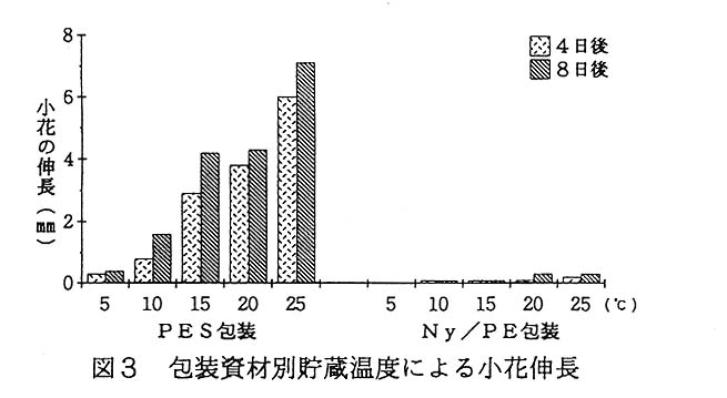 現行のPES包装では低温ほど小花の伸長が抑制される傾向を示したが、Ny/PE包装では温度に関係なく小花の伸長か著しく抑制され、25℃程度の比較的高い温度条件でも低酸素状態にすれば、小花の伸長は抑制できる(