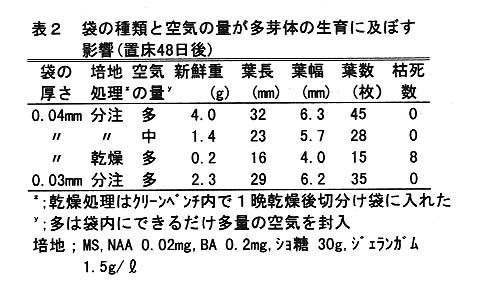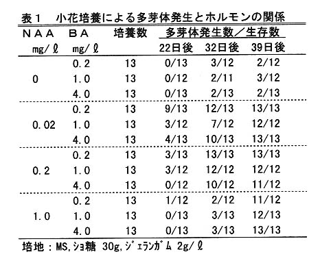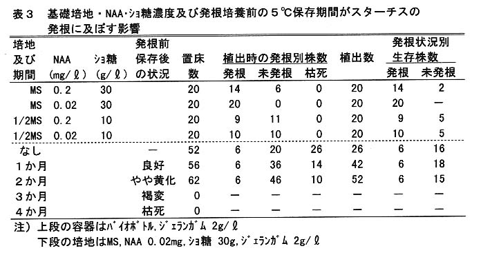 できる。NAA 0.02㎎/リットル、BA 0.2㎎/リットルのホルモンを含む培地に、置床後多くの空気を封入して増殖し、BAを除いた培地で通気性のある容器に置床すれば発根する。また、培養物は多芽体、発根後の苗とも、5℃で2か月ずつ