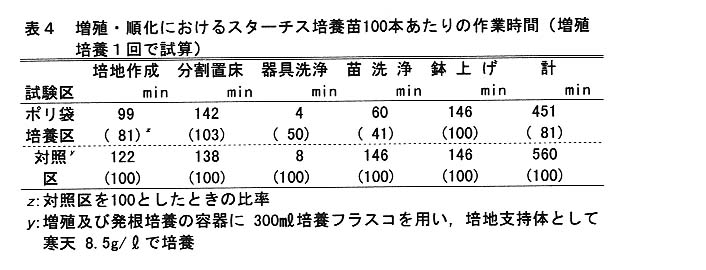 培養苗100本あたりの作業時間は、容器にポリ袋を用いることにより、ガラス容器に比べて培地作製が約20%、支持体にジェランガムを用いることにより、寒天に比べて苗洗浄が約60%、それぞれ短縮できる。また、全体でも約20%短縮でき、省力的な培養法である(