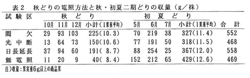 果実の重量は、秋どりでは光中断、間欠電照が重く、初夏どりでは無電照、日長延長が重くなる(