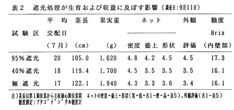 果実のネット、外観評価、糖度は強遮光処理を行うと最も良好となるが、40%程度の遮光処理では果実品質向上には効果が見られない(