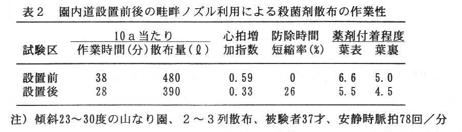- 斜面に対し斜めに園内道を設置した急傾斜地園で畦畔ノズルを用いた殺菌剤散布時間は設置前に比べ約1/4短縮され、散布量も減少し(81%)心拍増加指数も低下するが、この場合は薬剤の付着程度がやや劣る(表2)。