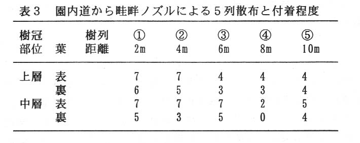 - 畦畔ノズルを用いた散布は樹列数が多くなると薬剤の付着程度が劣る。このため、丁寧な散布を必要とする殺虫剤散布では1列毎(距離約2m)に散布する必要がある(表1、表3)。