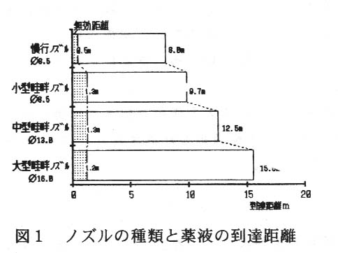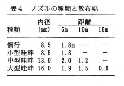 - 25kg/cm2の圧力のもとで、薬剤の到達距離は内径に比例して遠くなる。また散布福は噴出口から5mまでは差がみられないが、10mでは中型、大型畦畔ノズルが優れる(図1、表4)。