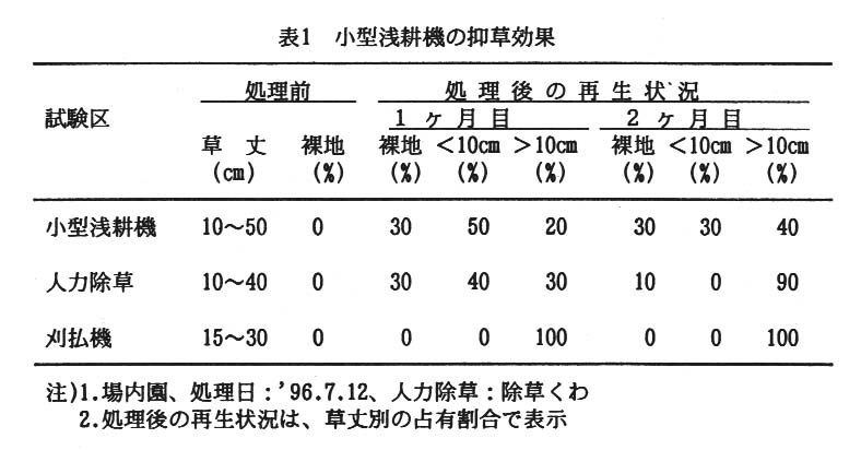 小型浅耕機は、草丈20cm以下で特に除草効果が大きく、春肥散布後の中耕除草に適している。