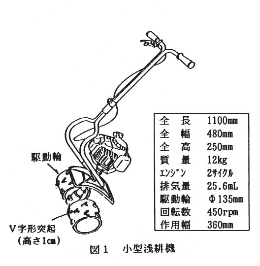 は、表面に小突起を備えた駆動輪を高速回転させることによって、表層土壌を攪拌する小型管理機である。果樹の根を傷めずに